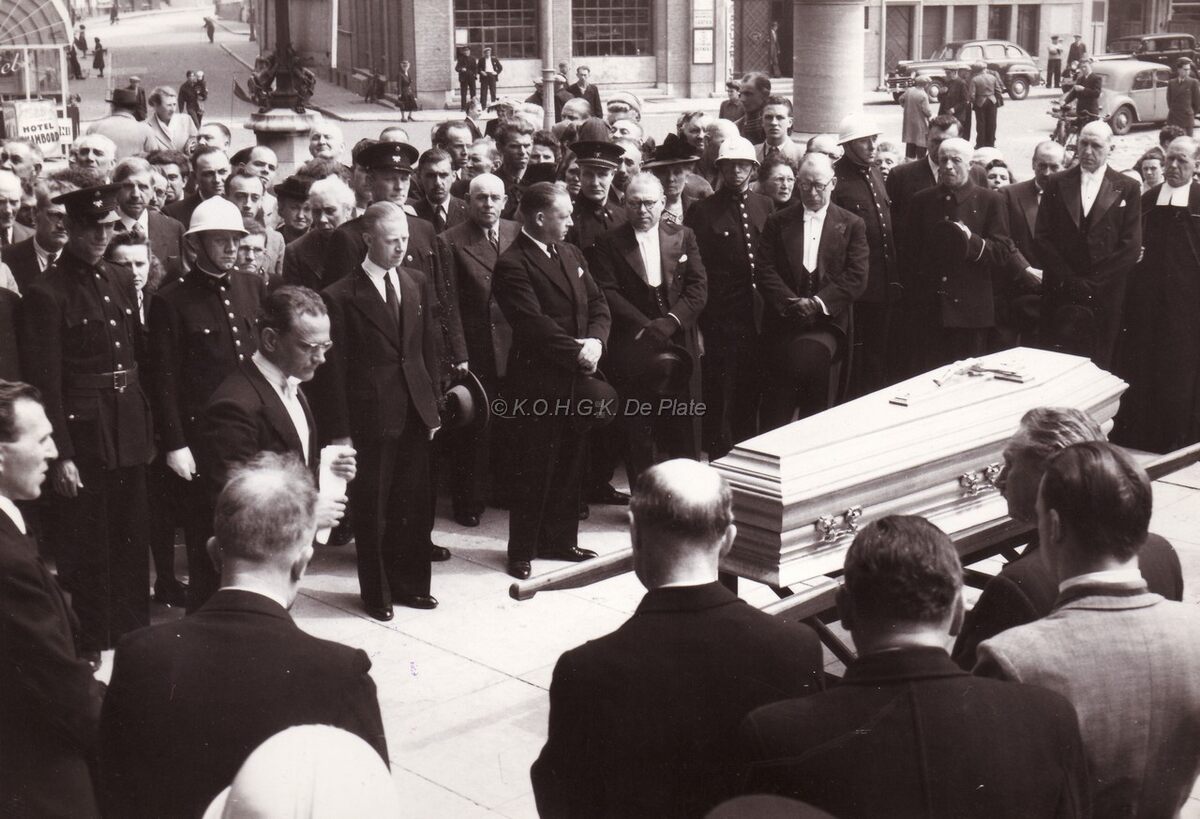 De lijkbaar staat opgesteld aan de inkom van de Sint Petrus en Pauluskerk. Centraal achter de lijkkist burgemeester Henri Serruys. Uiterst rechts staat een dominee en naast hem Robert Elleboudt. Op de achtergrond het Zeemanshuis met het Aquarium.