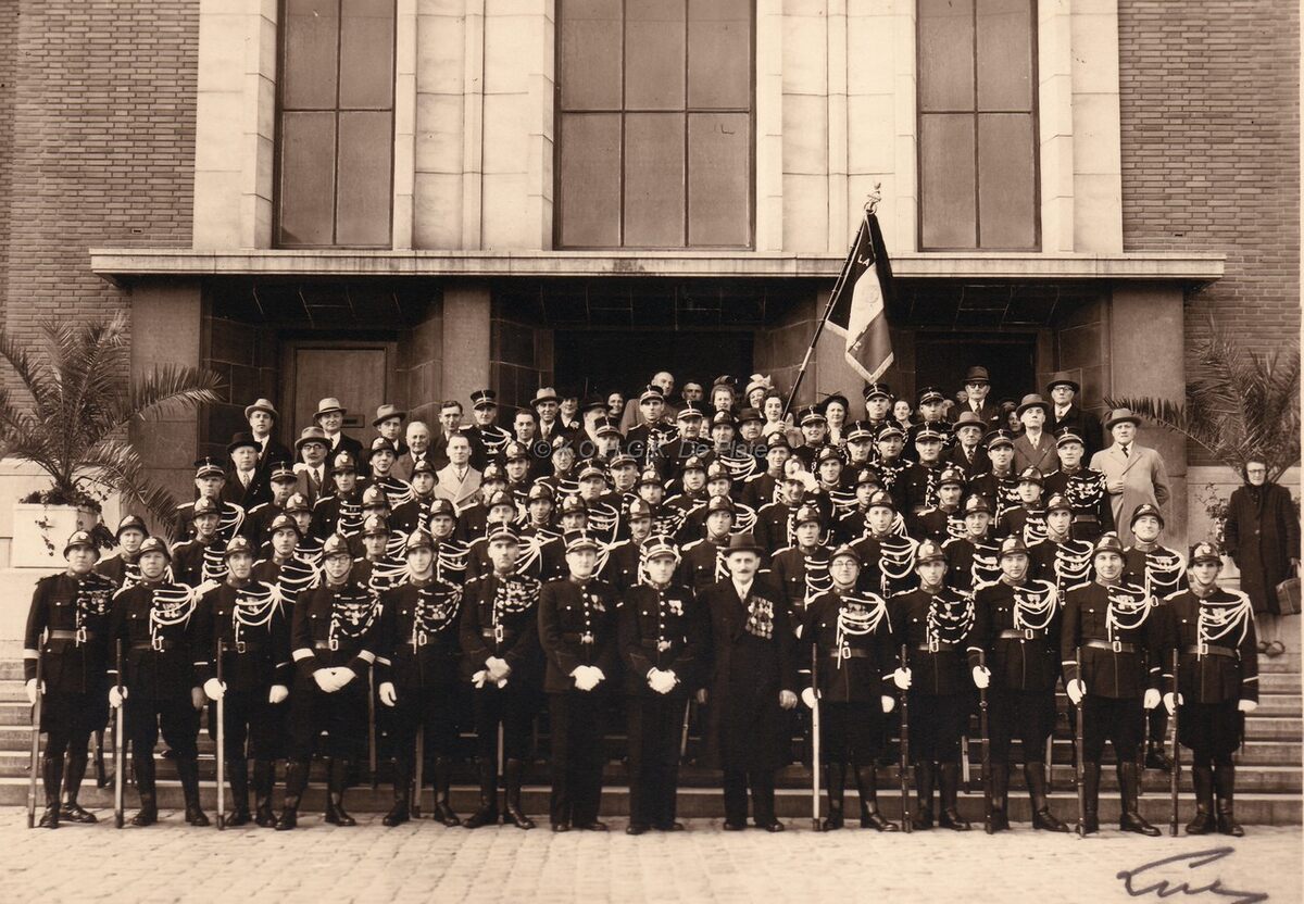 De Oostendse rijkswachters op de trap van het dienstdoend stadhuis, huidig gerechtshof, na een ontvangst door het stadsbestuur.