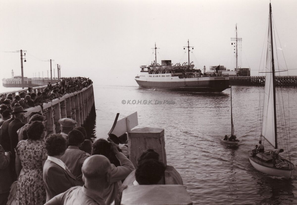 Op een zomerse namiddag vaart de "Prinses Joséphine-Charlotte" onder grote belangstelling de Oostendse haven in. Links het Weststaketsel en rechts, het Ooststaketsel met tijseinpost