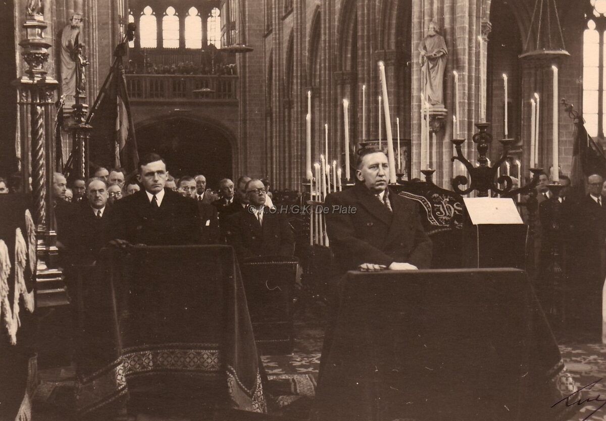 De Sint Petrus en Pauluskerk, een begrafenismis is bezig. Vooraan links, Pierre Van Outryve d'Ydewalle, provinciegoeverneur. Rechts, minister P.W. Segers. Op de tweede rij, burgemeester Henri Serruys
