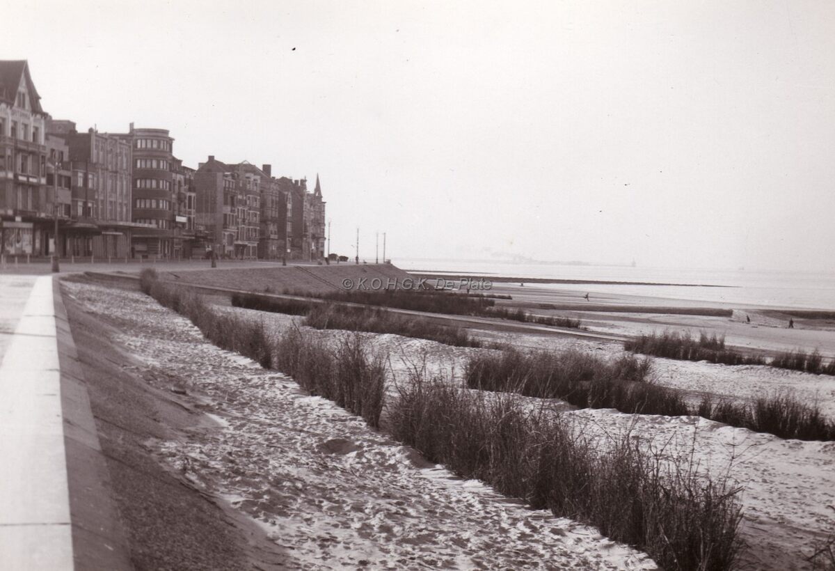 Het strand en de Zeedijk te Heist tijdens de winter.Op het strand zijn rijshouten haagjes geplaatst om de zandverstuivingen ondrr controle te houden.
