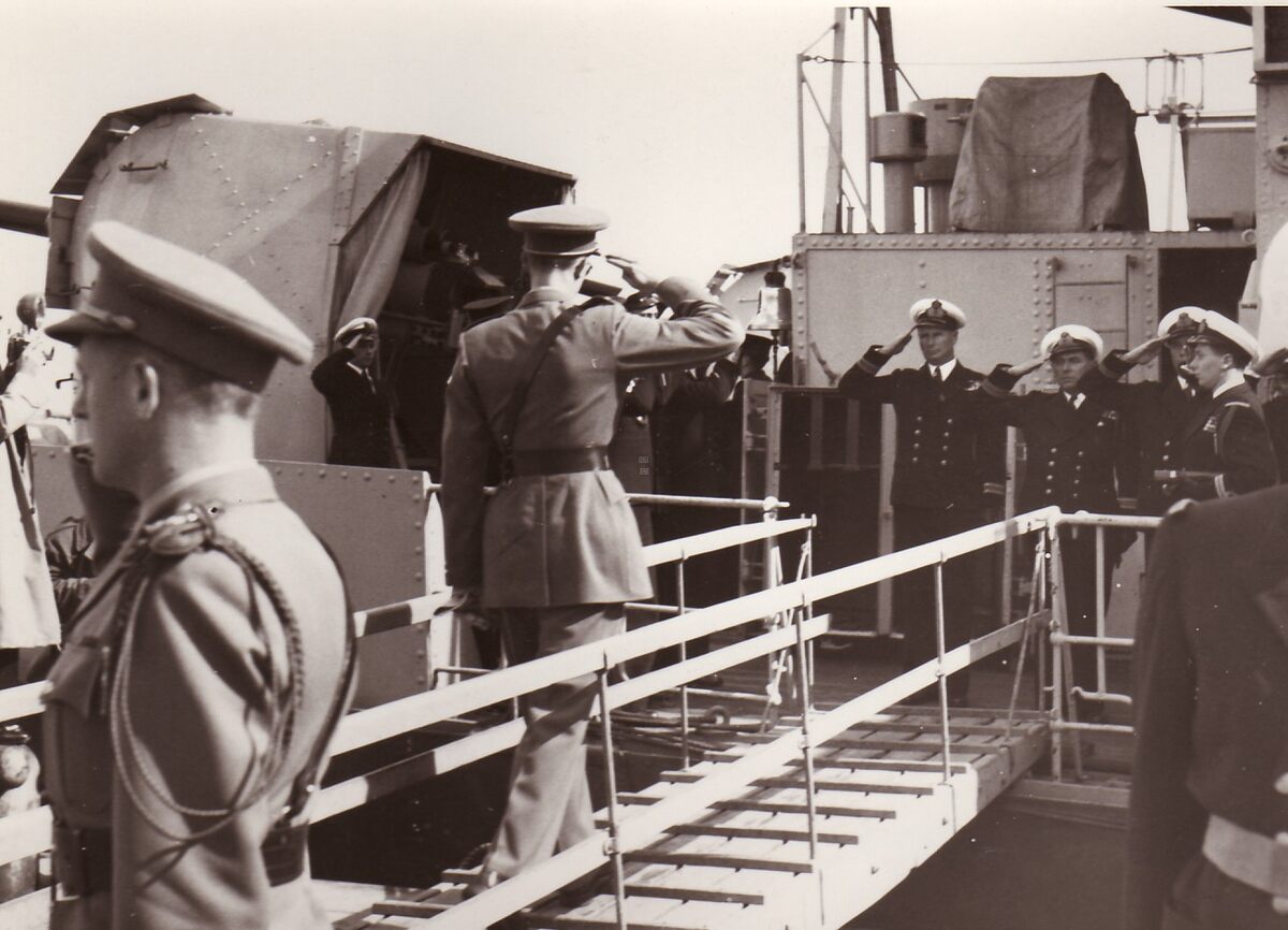 Formaat : 13 x 18 cm. - Hij gaat aan boord van een eenheid van de Zeemacht. De officicier uiterst links is Luitenant ter Zee 1 Klas Georges Depoorter