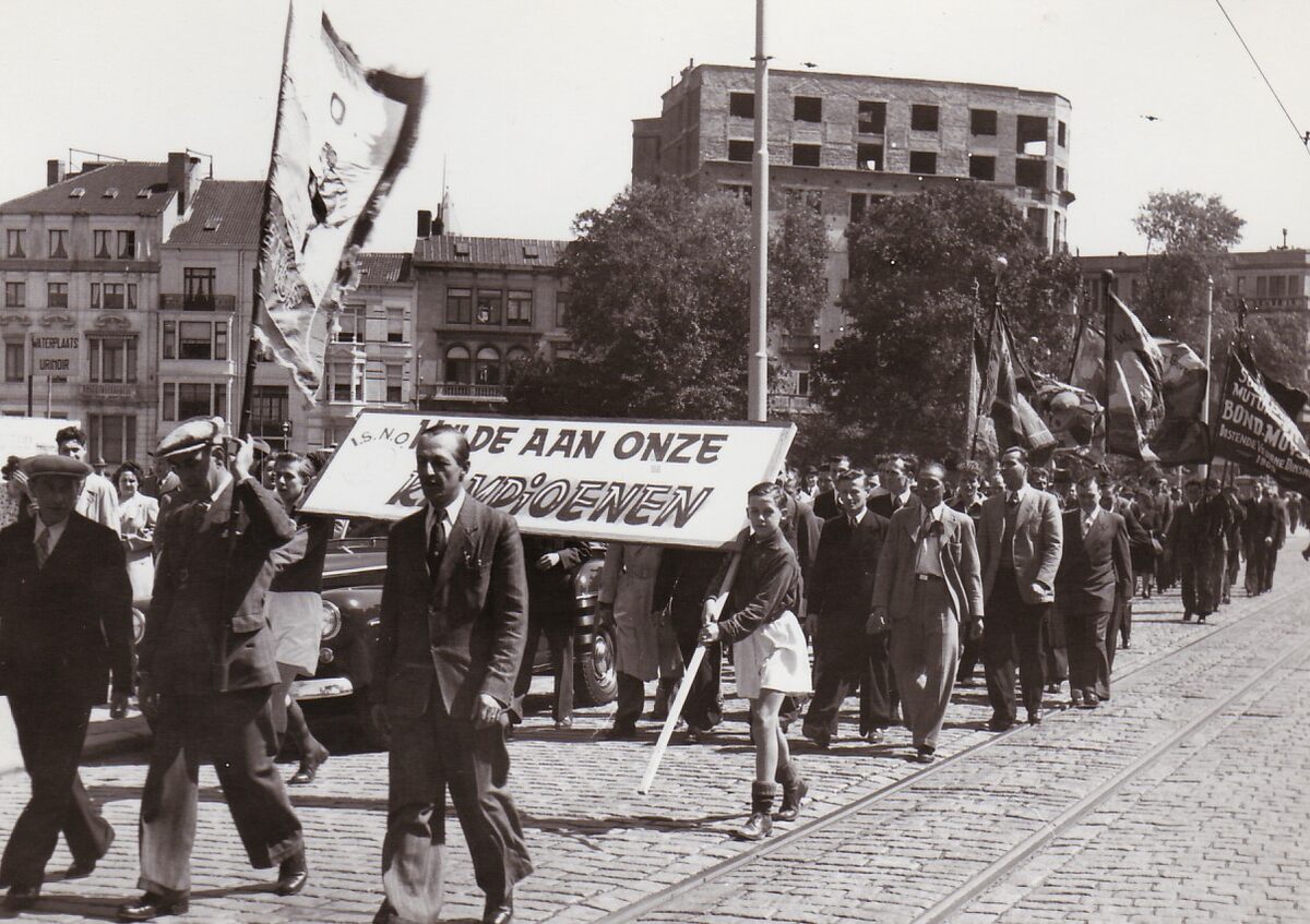 Kampioenenhuldiging I.S.N.O. (?) een stoet met een afdeling van de socialistische ziekenbond "Bond Moyson",op de Vindictivelaan ter hoogte van het Canadaplein.