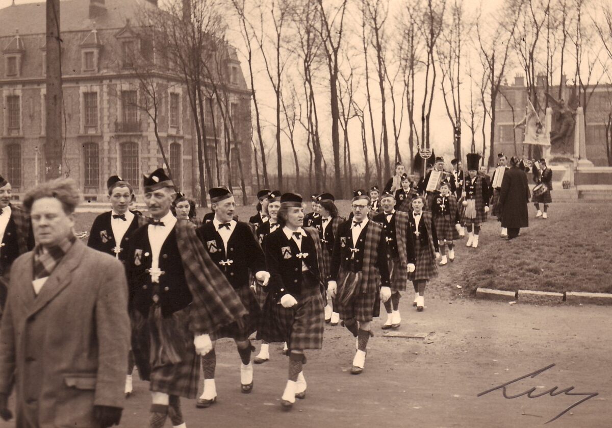 De Oostendse Schotten hebben net een bloemenhulde gebracht aan het monument van het 3e en 23e linieregiment aan de Bootsman Jonsenkazerne.Links het gebouw met de mess der officieren.