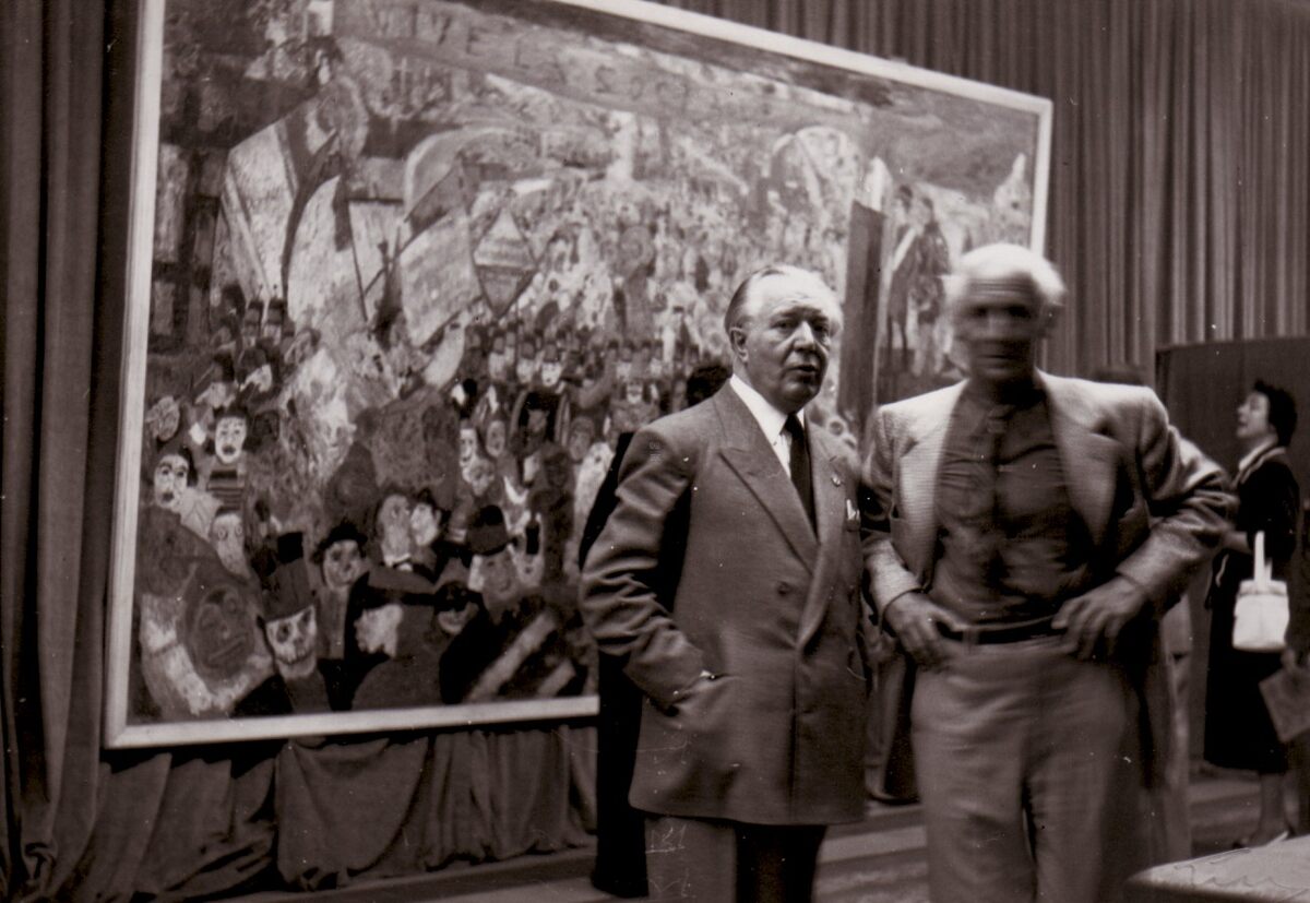 Twee inrichters van de tentoonstelling van Moderne Kunst 1949 voor een doek van James ENSOR. (Intrede van Christus te Brussel). Rechts staat Max ERNST.