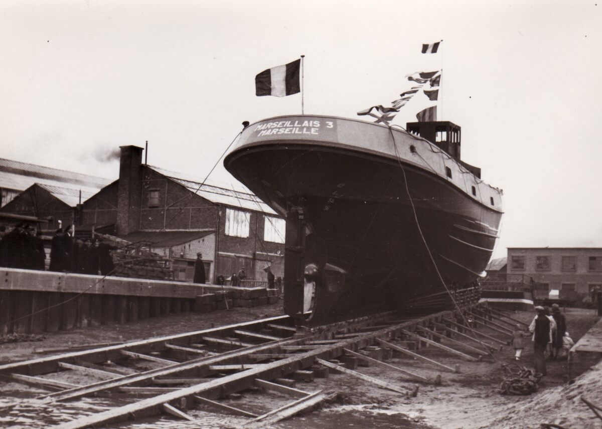 De Marseillais 3 op de helling bij de scheepswerf Beliard-Crighton & C° aan het Zwaaidok, klaar voor de tewaterlating.
