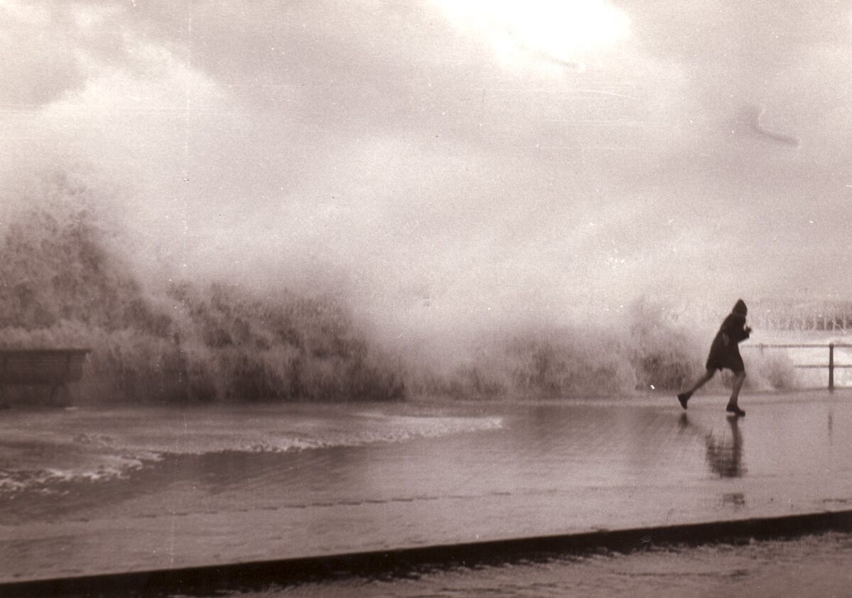 Een jongen tracht een nat pak te ontlopen op de Albert I Promenade bij stormweer.