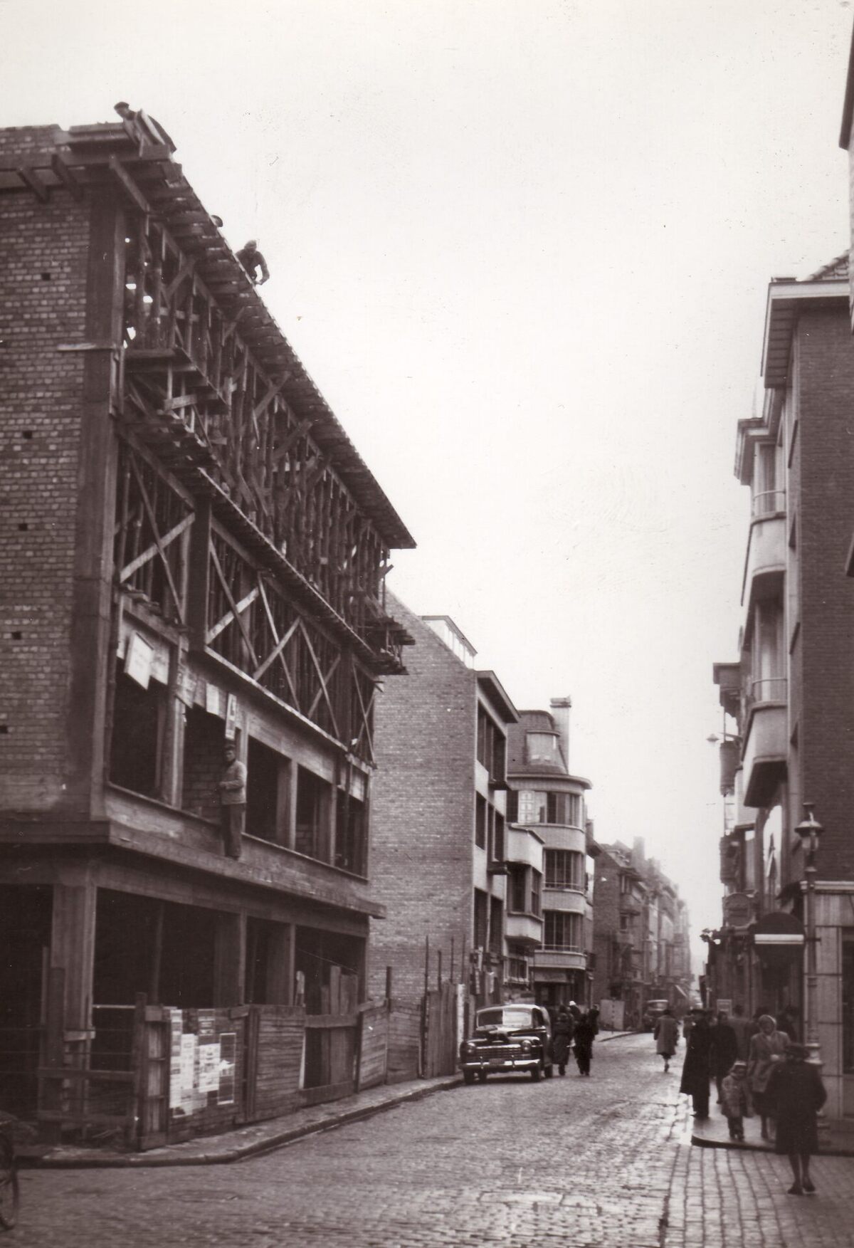 Formaat : 18 x 13 cm. - Bouw van een appartementsgebouw op de hoek van de Kapellestraat en de Witenonnenstraat, met onderaan de toekomstige kledingzaak voor mannen Savelkoul. Plaats van de huidige Inno (2025)