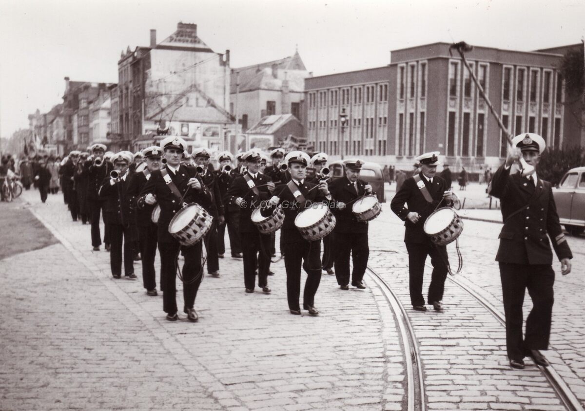 De stadsharmonie op de Vindictivelaan aan het dienstdoend stadhuis (huidig gerechtshof). Een stadtram is nog net te zien.