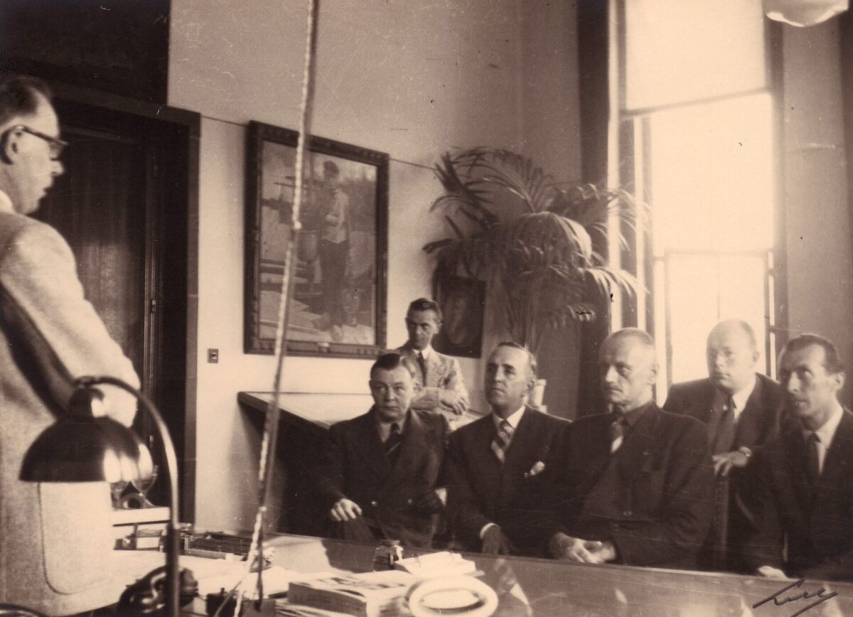 Formaat : 13 x18 cm. - Ontvangst op het dienstdoend stadhuis (huidig gerechtsgebouw), toespraak door burgemeester Hendrik Serruys.
