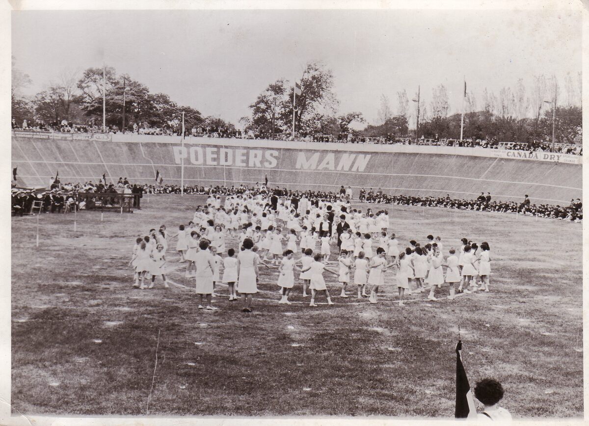 Fo'maat 18 x 13 cm. - Jaarlijks openluchtfeesten. Alle basisscholen namen er deel aan. Op het programma : gemeenschappelijke zang, turnoefeningen en loopwedstrijden. De winnende scholen kregen een beker.