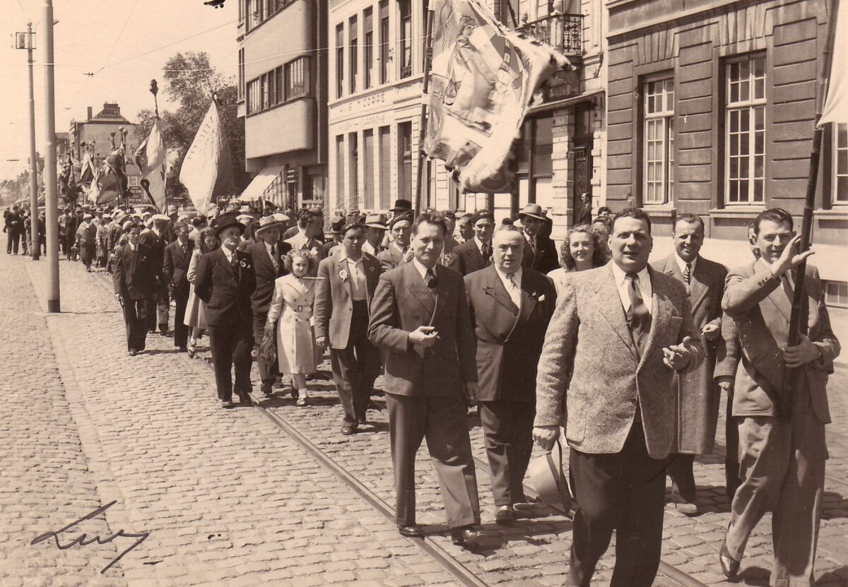 De stoet van SKVO kampioen met hun vlaggen op de Vindictivelaan.