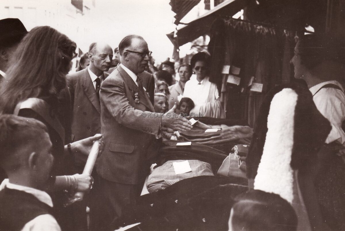Burgemeester Henri Serruys begroet een deelneemster aan de braderie. Achter hem staat Marie-Jozef Porta.