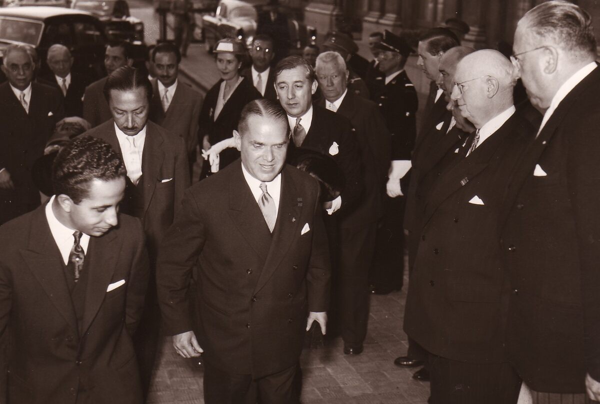 Koning Faisal van Irak wordt rondgeleid door burgemeester Adolf VAN GLABBEKE tijdens zijn bezoek aan de stad.Tweede van rechts Michel SURMONT,stadssecretaris,naast deze Maurice QUAGHEBEUR en Jan PIERS,schepenen.