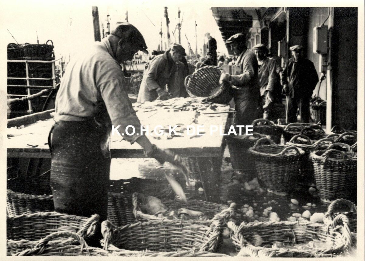 Formaat : 13 x 18 cm. - Sorteren van de vis. De vislossers halen het ijs van tussen de vissen en sorteren die per soort en grootte in vismijnbennen.