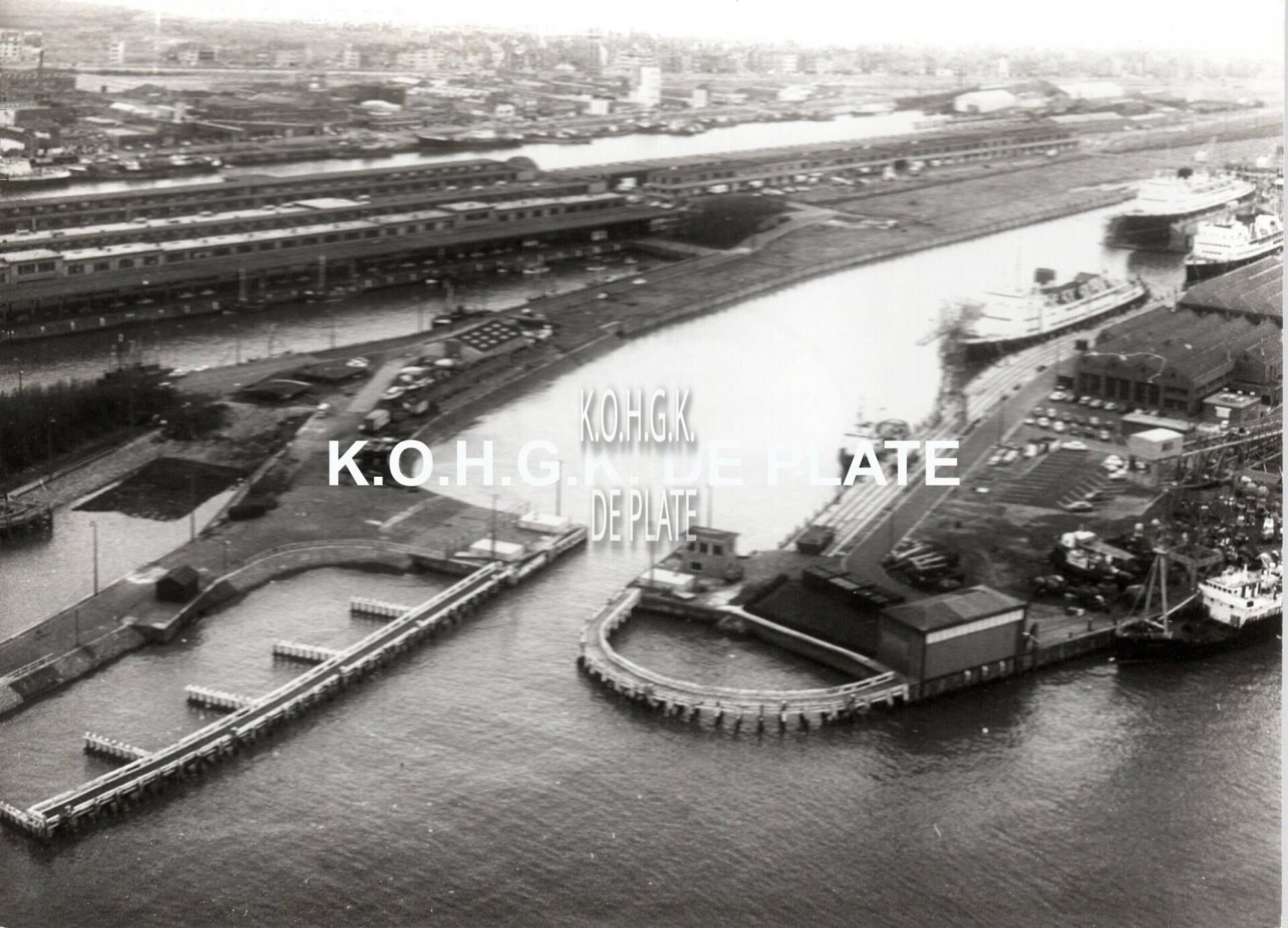 Formaat : 13 x 17,5 cm. - Luchtfoto. - We zien het Zeewezendok met enkelvoudige sluis. Rechts een gedeelte van de werkhuizen van het Zeewezen. Het Tijdok met de Stedelijke Vismijn en het Visserijdok. Op de achtergrond de Vuurtorenwijk