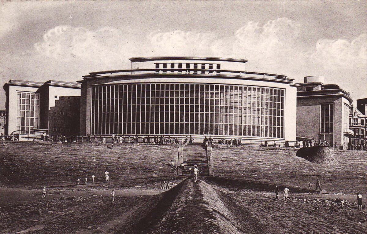 De noordgevel van het vierde Kursaal gelegen langs de Albert I-Promenade. Vooraan, een golfbreker op het groot strand