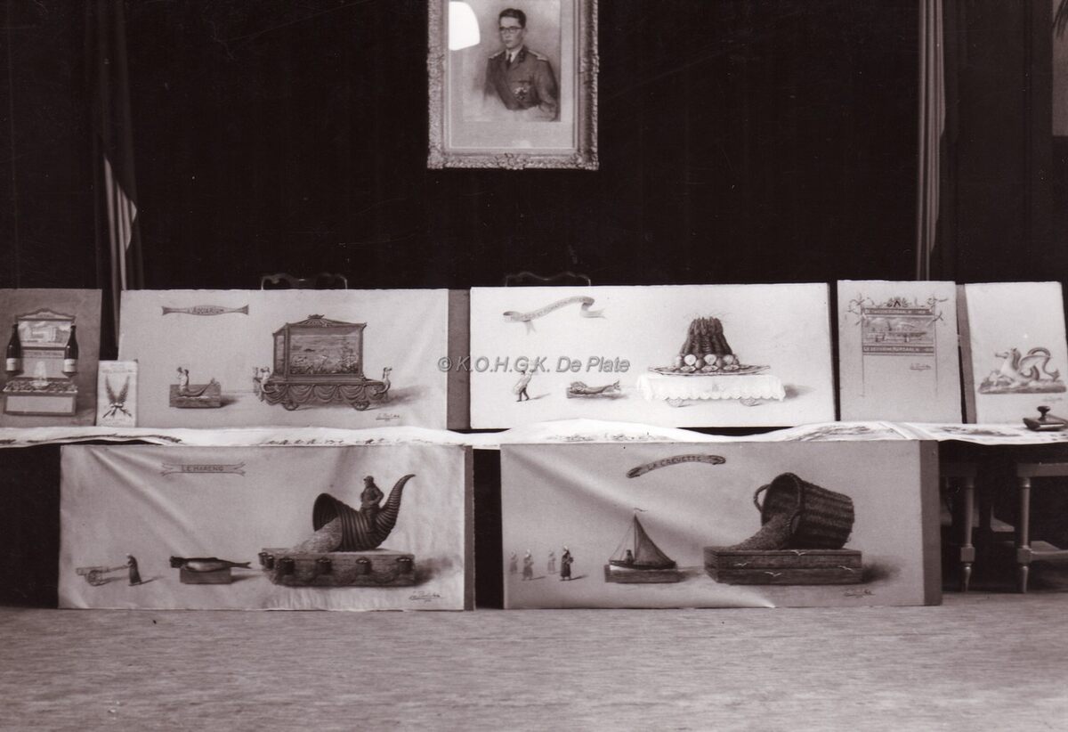 Presentatie van de ontwerpen voor praalwagens voor de praalstoet n.a.v. de openening van het nieuwe Casino-Kursaal. De ontwerpen van praalwagens zijn van Emile Bulcke. In het Gerechtshof.