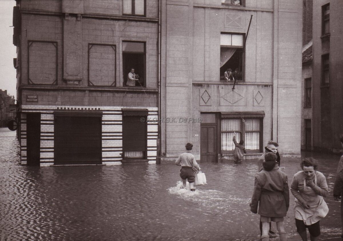 Het ondergelopen Vissersplein na de overstroming 1953. Links de Ooststraat,rechts Straat zonder Einde. Zie ook 2014/0158.