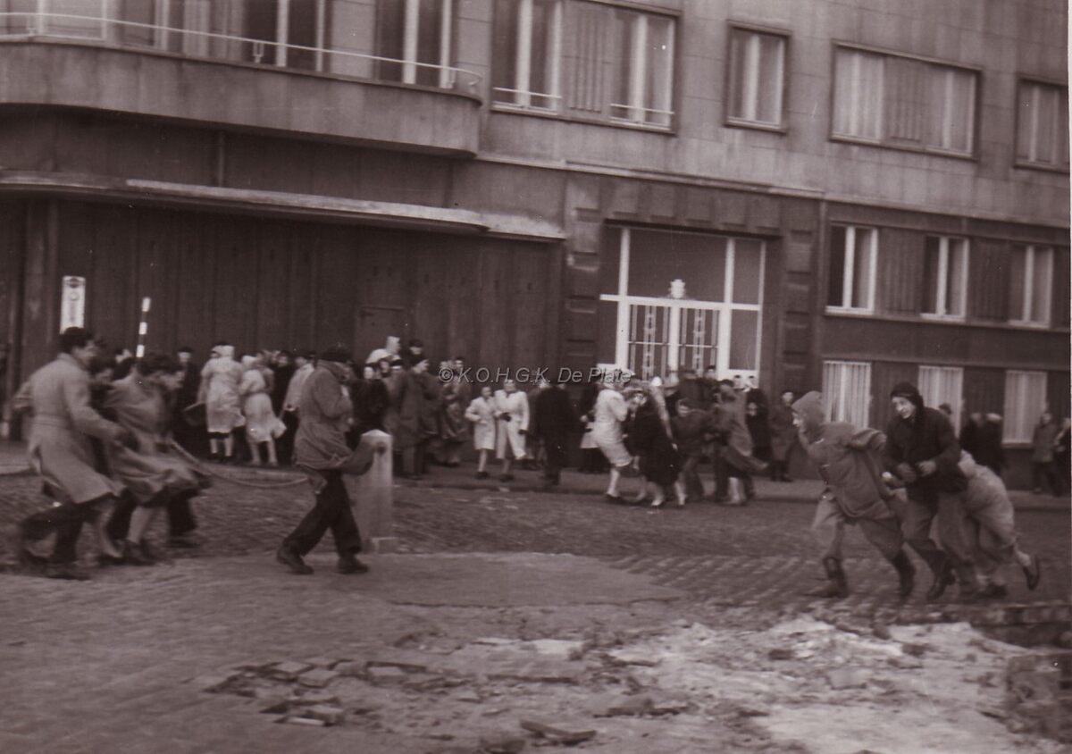 Kijkers tornen tegen de stormwind de Vlaanderenhelling op na de grote overstroming 1953. (Of worden er afgejaagd !)