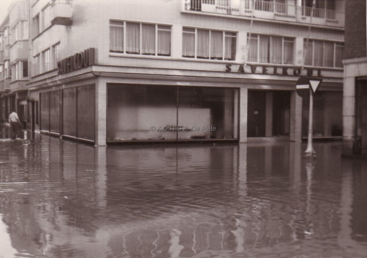 Hoek van de Kapelle- en Wittenonnenstraat na de grote overstroming van 01-02-1953. Savelkoul, Kapellestraat 41. Heden (2015) "Inno"