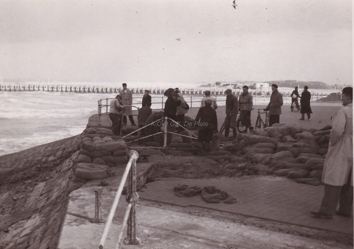 Het Zeeheldenplein na de grote overstroming van 01-02-1953 .Men is (reeds) begonnen met de trap naar het strand te herstellen. Een stapel "vaderlandertjes" ligt klaar.
