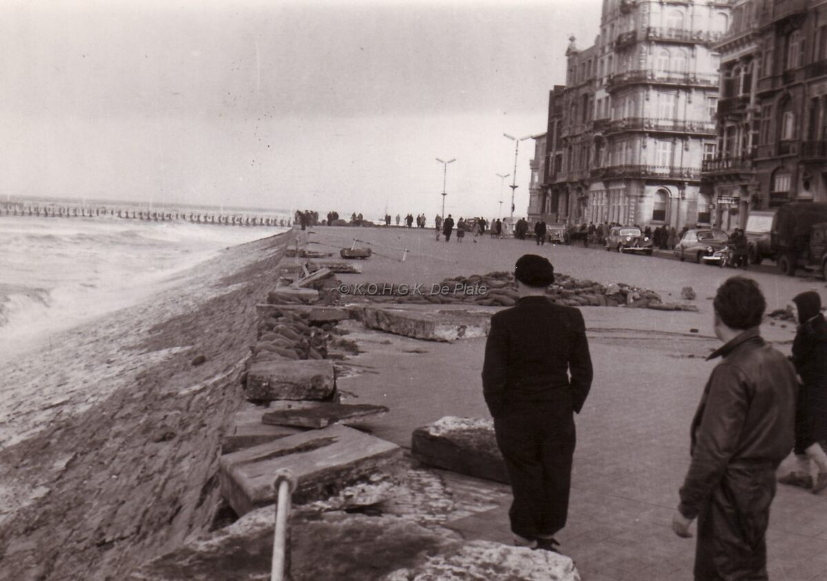 De beschadigde Albert I Promenade na de doortocht van de grote storm van 01-02-1953.Rechts hotel Osborne op de hoek van de Kapucijnenstraat.