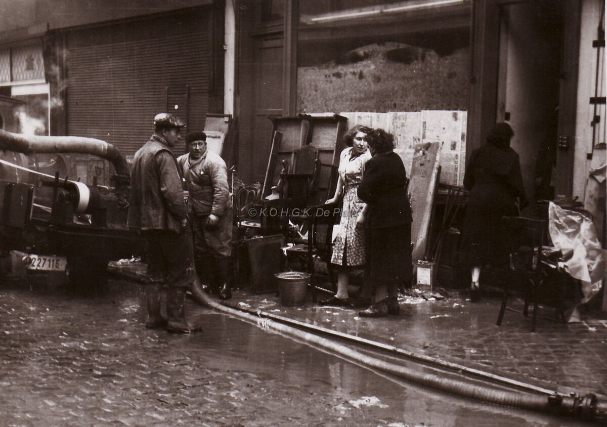 De inboedel van deze overstroomde kelderverdieping staat op de stoep na de grote overstroming van 01-02-1953.De kelder wordt door de brandweer leeggepompt.