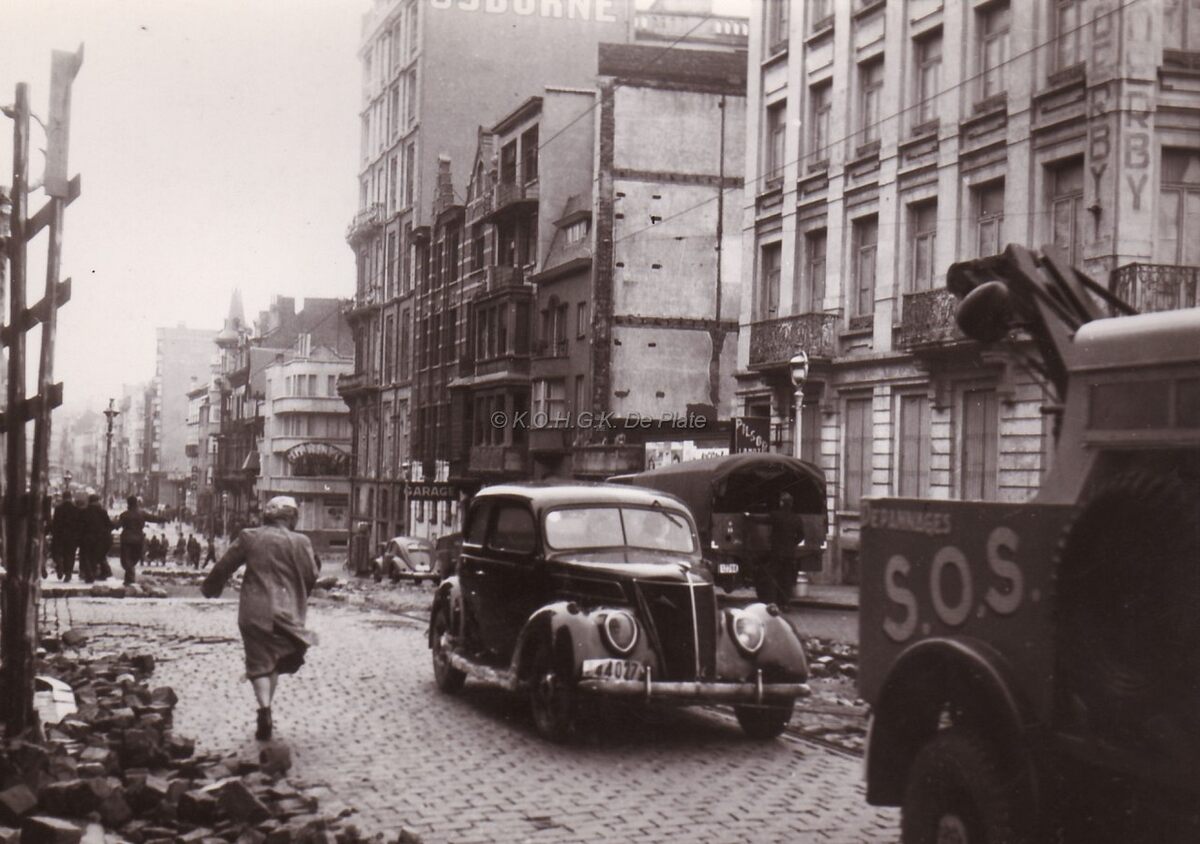 De helling Van Iseghemlaan na de grote overstroming van 01-02-1953 er is grote schade aan het wegdek.Foto van op de dijk richting kursaal.