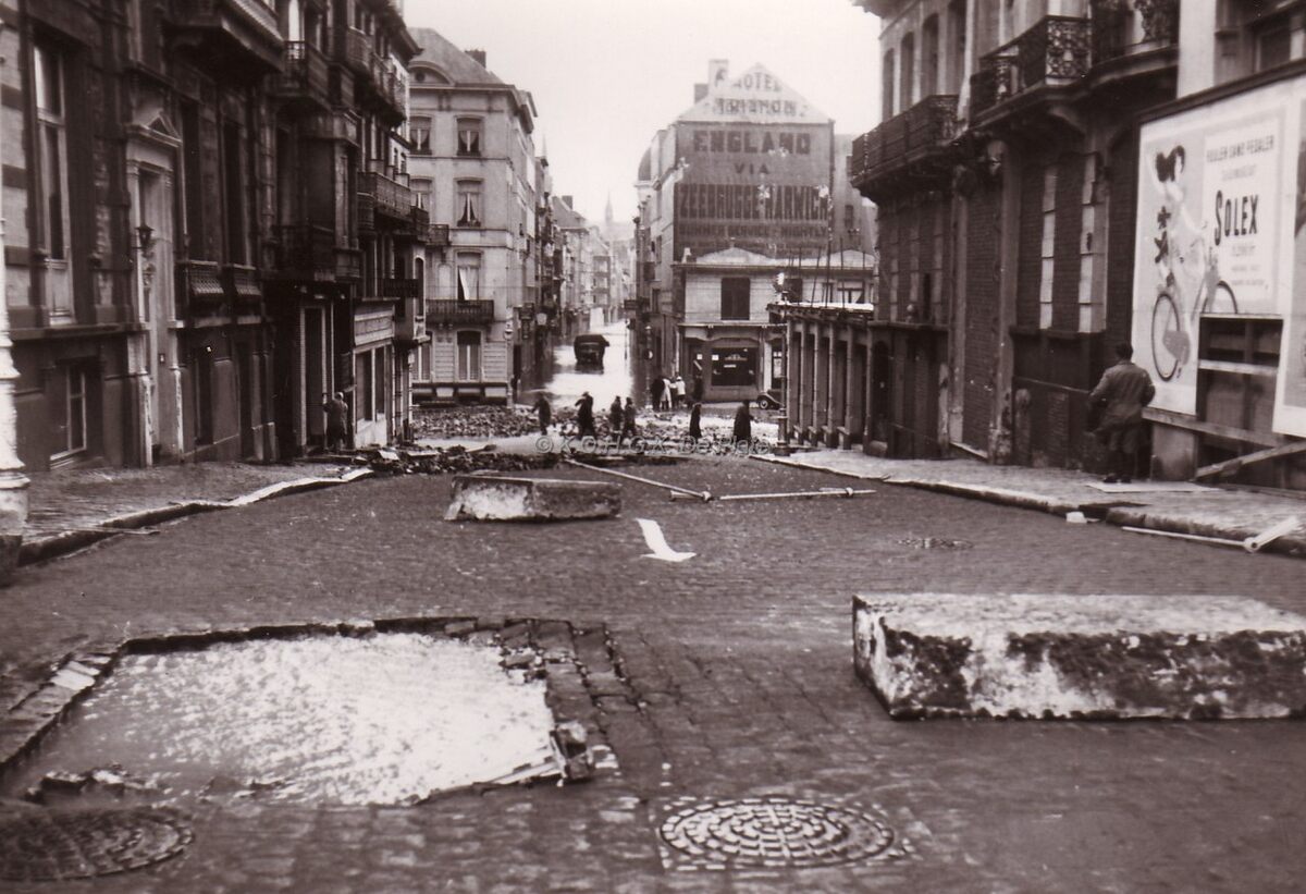 De Louisastraat, gezien van aan de Albert I Promenade, er is grote schade aan het wegdek na de storm van 01-02-1953. Rechts, de hoek Van Iseghemlaan met "La Terrasse".