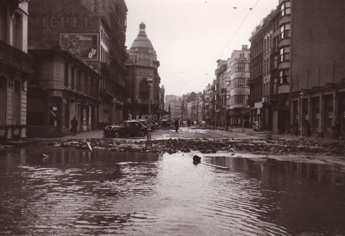 De Van Iseghemlaan ter hoogte van de Louisastraat na de grote overstroming van 01-02-1953. Zware schade aan het wegdek. Achteraan links de schouwburg op de hoek Vlaanderenstraat.