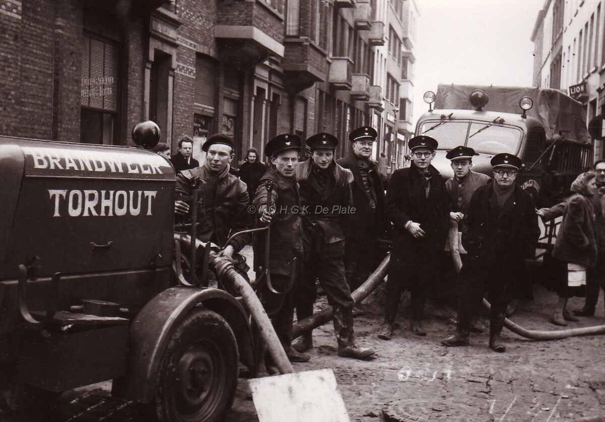 De Nieuwstraat. Een ploeg brandweerlieden uit Torhout helpen met hun pomp na de overstroming van 01-02-1953.