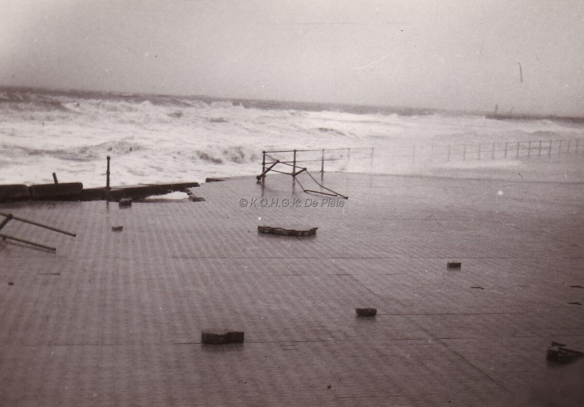 Albert I Promenade, detail van de schade aan de zeedijk. Losgerukte stenen en vernielde reling. Rechts het westelijk staketsel.