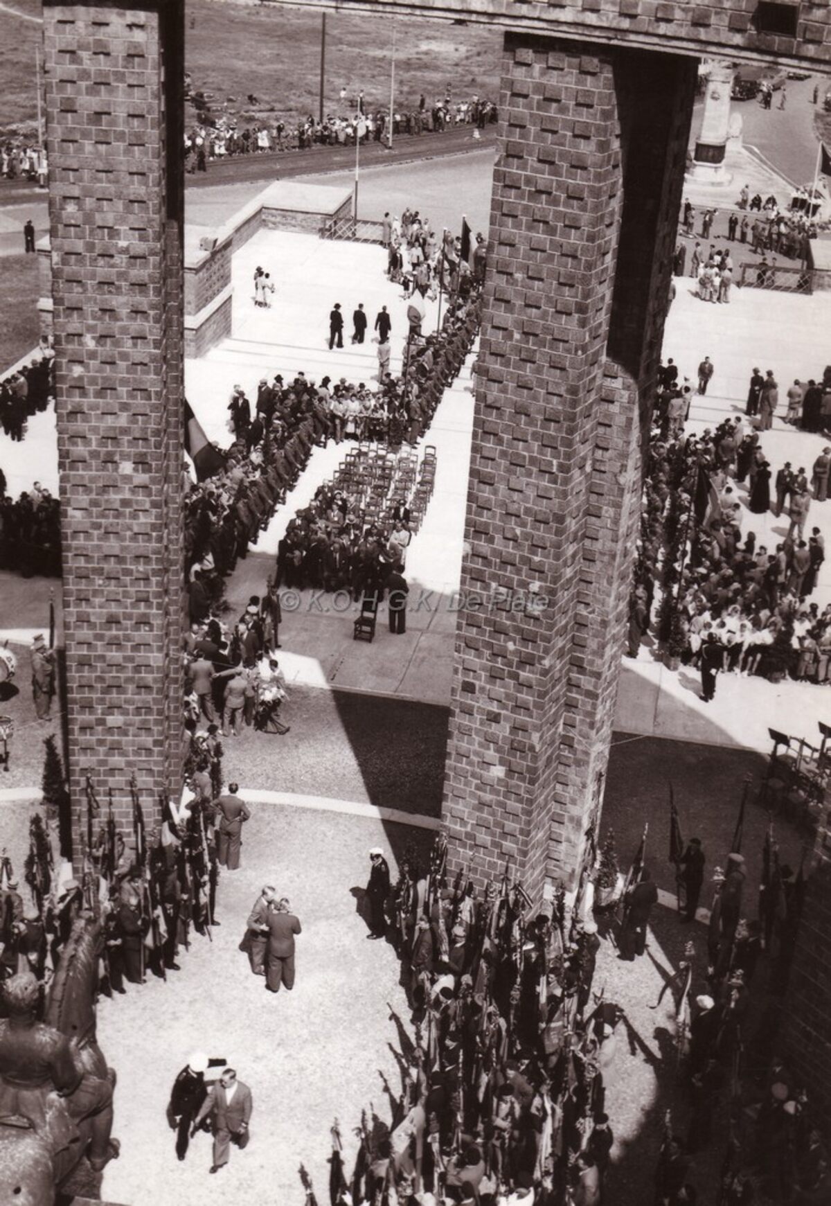 Zicht van bovenaf op een huldiging aan het monument Albert I te Nieuwpoort.