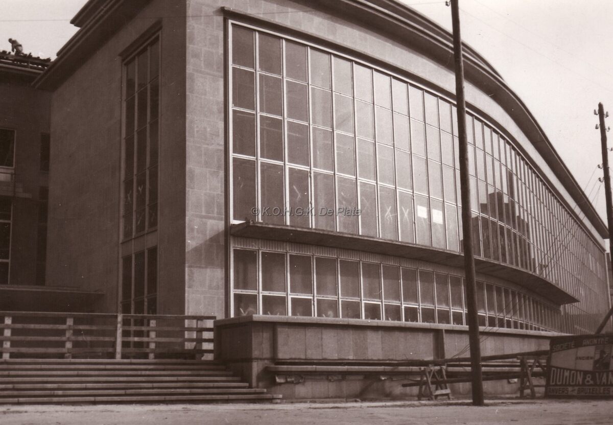 De westgevel in opbouw, zijde Albert I-promenade (Petit Nice). Let op de oude telefoonpalen met de porceleinen (of glazen) isolatoren.