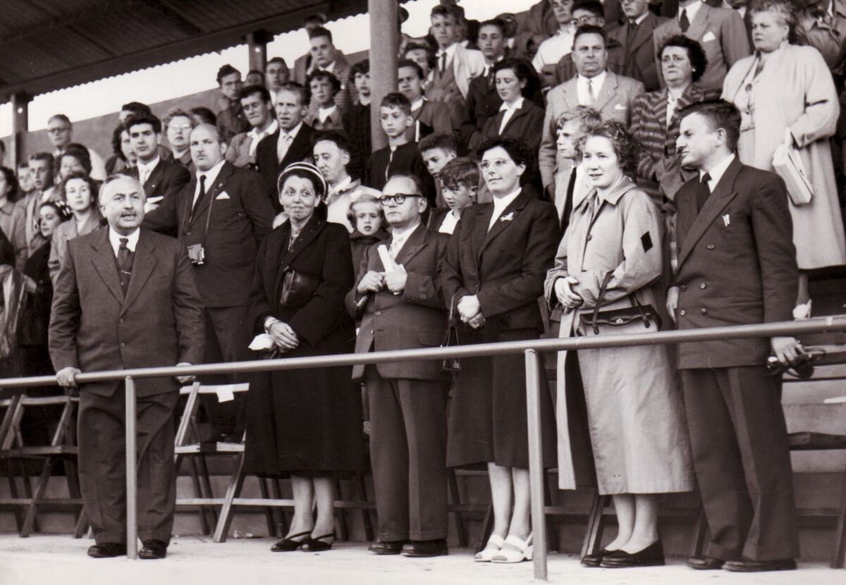 Het Hermesathletiekstadion tijdens een meeting. Zicht op de tribune.