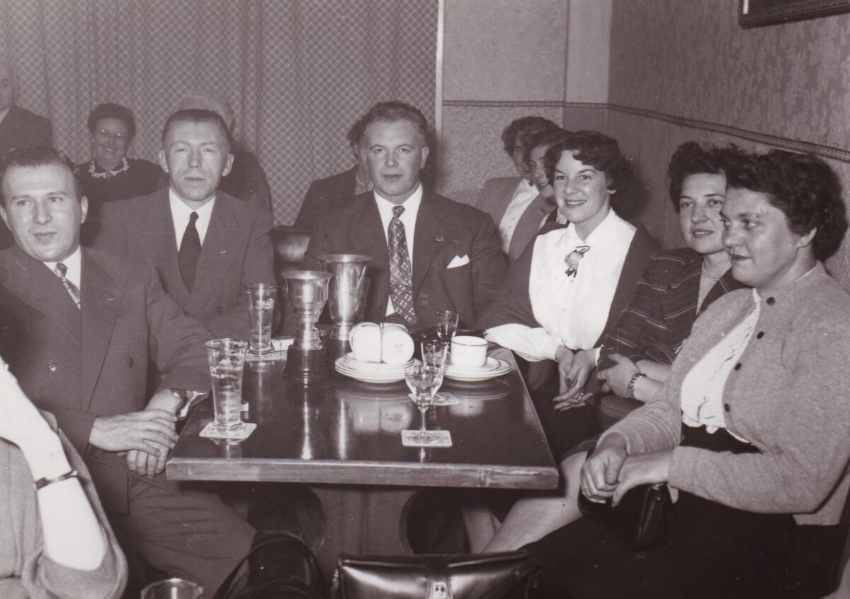 Centraal twee verdienstelijke leden van de balboogschuuters de Sint Jorisgilde in hun lokaal.