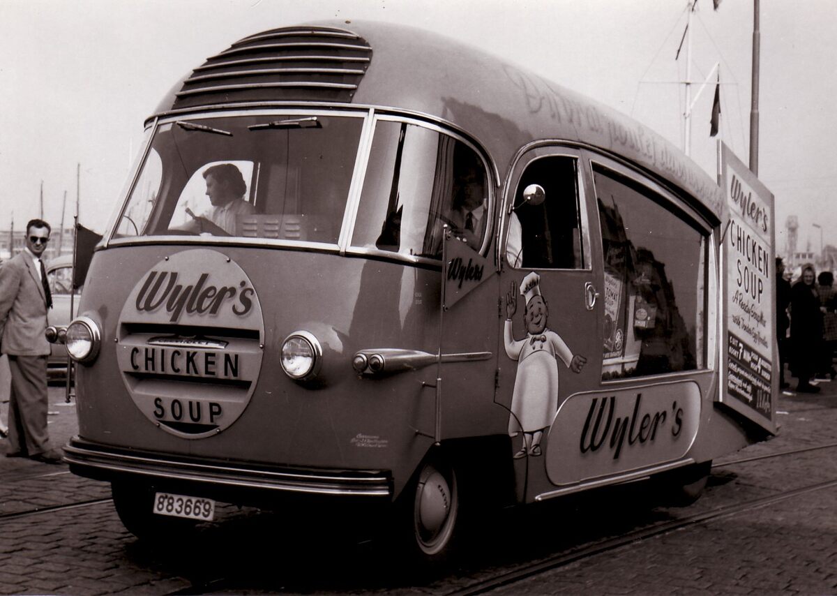 Een reclamestoet op de Visserskaai,de wagen van Wyler's chicken soup.
