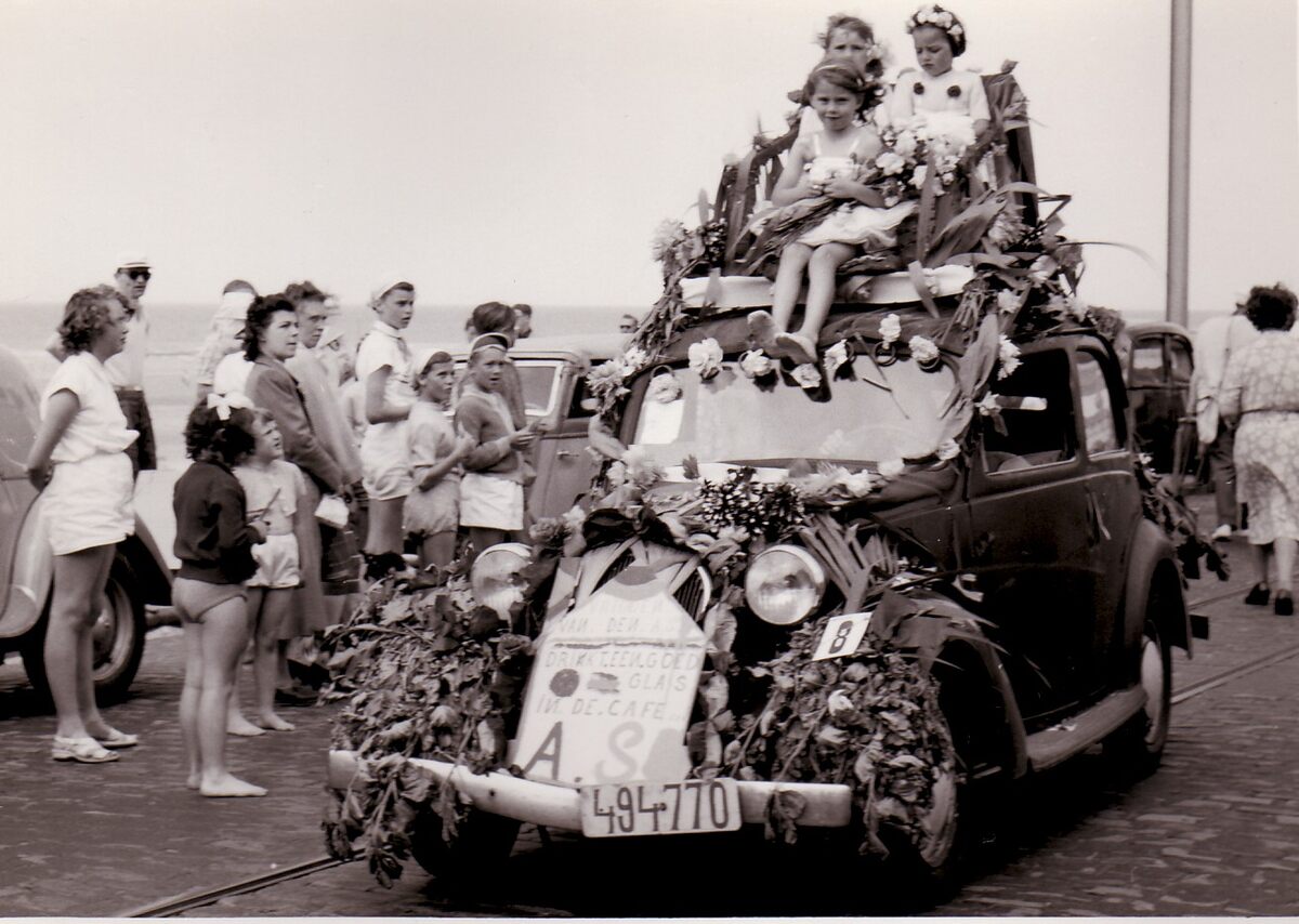 Een bebloemde auto met reclame voor café "ASO" een lokaal van de voetbalploeg,in een stoet op de Zeedijk te Mariakerke.