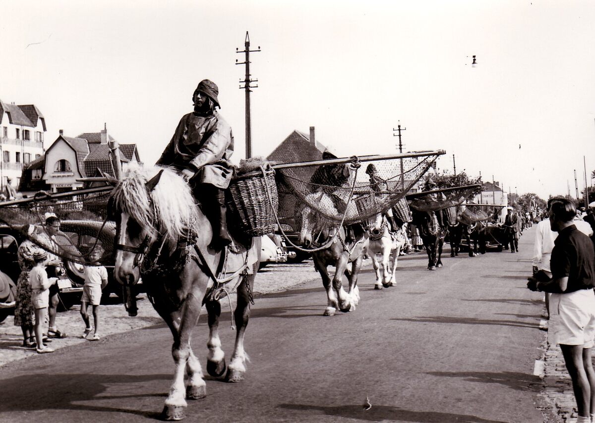 Oostduinkerkse paardenvissers in een stoet (niet Oostende).