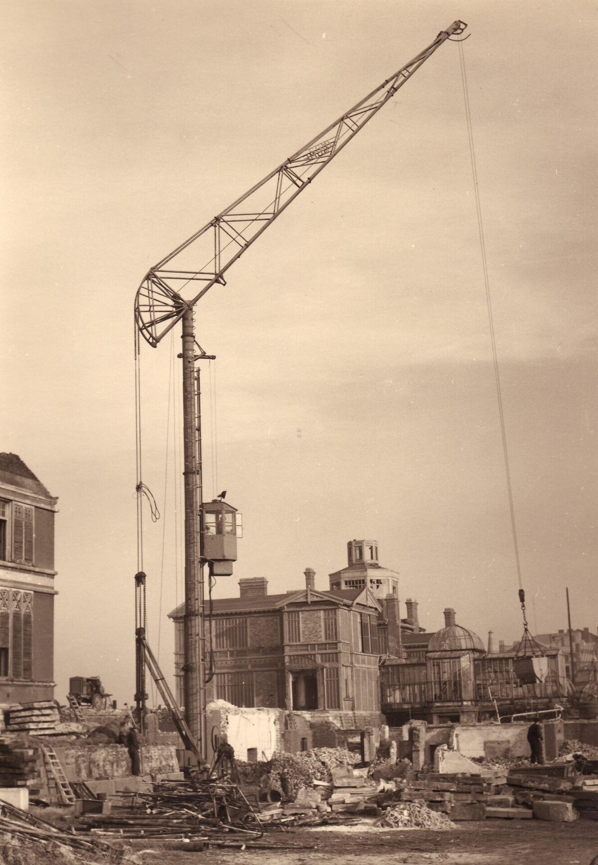 Formaat : 18 x 13 cm. - Zicht op de werf met kraan van de bouwonderneming Wwe J. Van Coillie, tijdens de sloop van de puinen van de koninklijke villa na de Tweede Wereldoorlog.