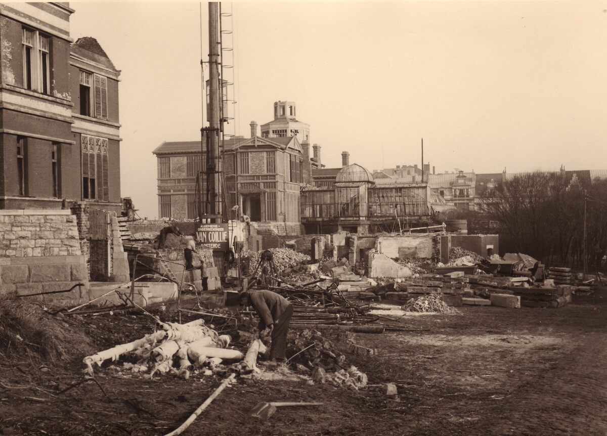 Formaat : 13 x 18 cm. - Zicht op de werf, de sloop van de puinen van de koninklijke villa, door de Oostendse aannemersfirma Wwe J. Van Coillie, na de Tweede Wereldoorlog