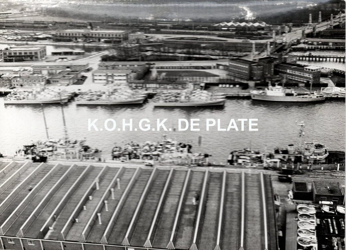 Formaat : 13 x 18 cm. - We zien oorlogsschepen van de Belgische Zeemacht aangemeerd aan de Diepwaterkaai. Rechts boven de Graaf de Smet de Nayerbruggen en aansluitend de Zeevaartschool langs de Slijkensesteenweg. Rechts, het schoolschip van de Rijksmarineschool "Commandant Fourcault" aangemeerd.