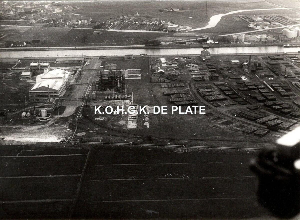 Formaat : 13 x 17,5 cm. - Luchtfoto. - Rechts, de creosoteerwerf gelegen langs het kanaal Oostende-Brugge.