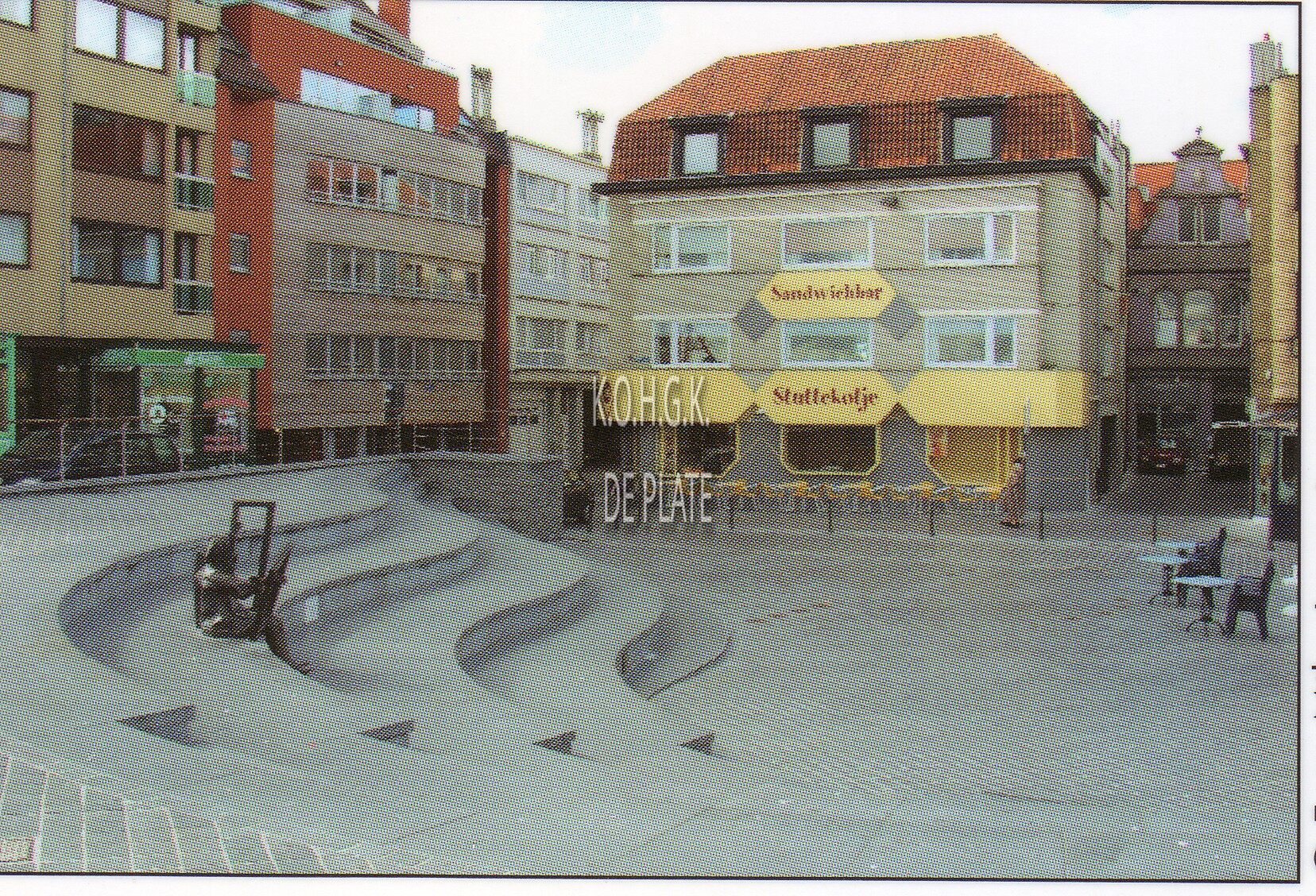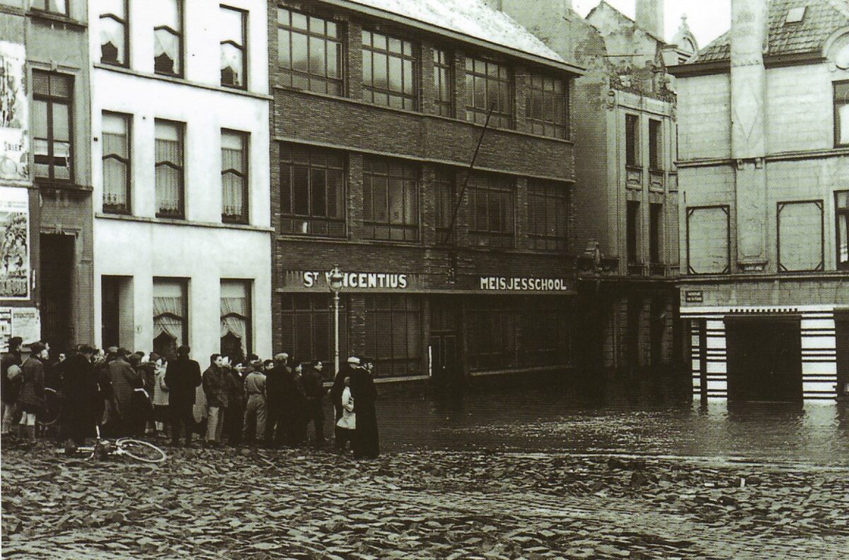 Tropic T 424. - Ostende oender woater 1953. - Het Vissersplein en zicht op de Sint-Vincentius Meisjesschool in de Ooststraat. - Inventaris 2020/1293 fotoarchief D2 album 3. Herkomst : Simoens
