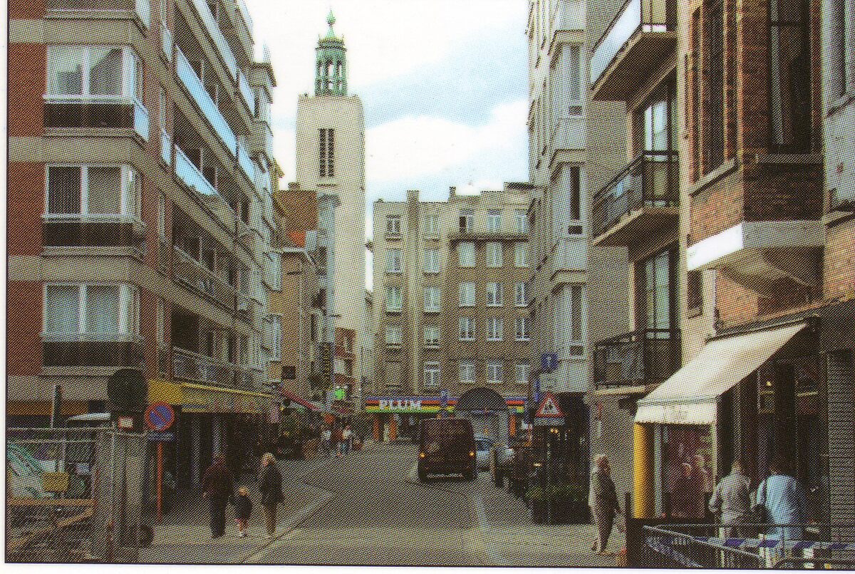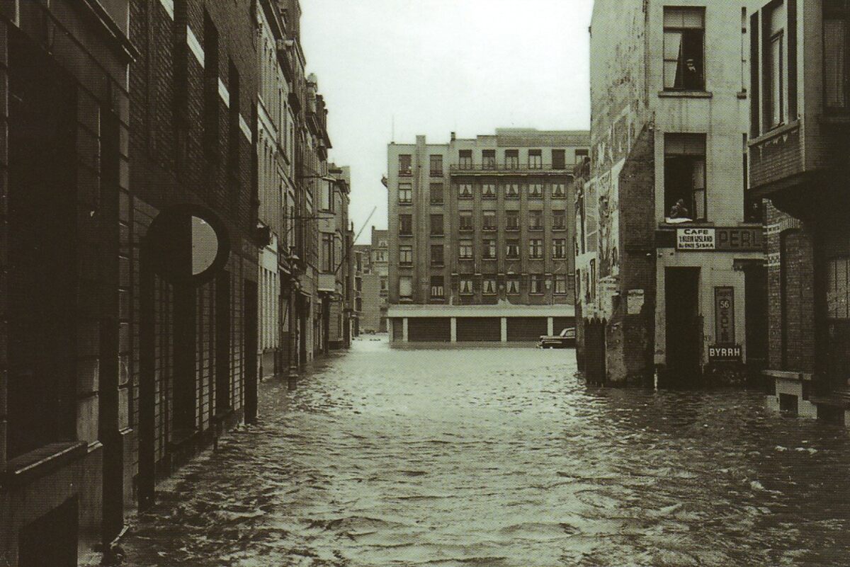 Tropic T 428. - Ostende oender woater 1953. - De Nieuwstraat richting Mijnplein. Op de hoek met de Schippersstraat, café 't Klein Ijsland - Inventaris 2020/1290 fotoarchief D2 album 3. Herkomst : Simoens