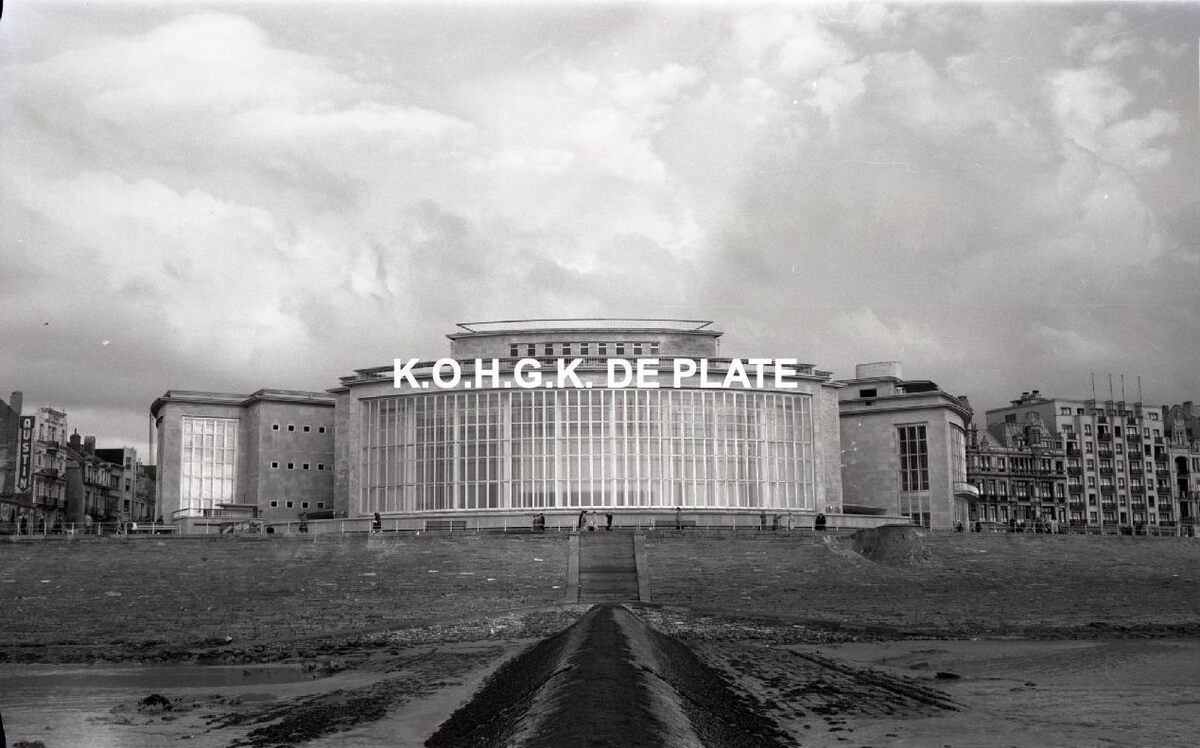 Negatief : 6 x 9 cm. - De noordgevel van de vierde Kursaal langs de Albert I-promenade, gezien vanop een golfbreker op het Groot Strand