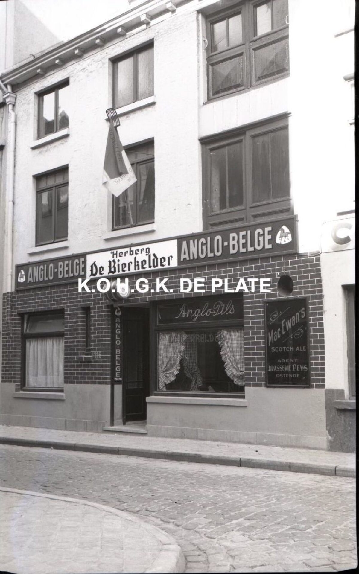 Negatief : 6 x 9 cm. - Op zondag 21 november 1954 werd hier onze vereniging als folklorevereniging "De Plate" symbolisch boven de doopvont gehouden. Tot de talrijke groep van stichters en medestichters behoorden o.a. : Arsène Blonde, Marcel Colombie, Florimond Corsellis, Gustaaf Decleer, Ernest De Taeye, Frank en Henri Edebau, John Hermans, Jo Deensen (Raymond Huilmand), Willy Laforce, Alfons Laridon, Marcel Messiaen, Ary Sleeks (Karel Seys), Frans Van Caillie, Edward Van Alderweireldt, Omer Vilain en één mevrouw, Germaine Van de Kerckhove. (J.B.
