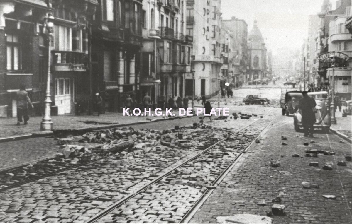 Formaat : 16 x 24 cm. - De Van Iseghemlaan. Links, op de hoek met de Kapucijnenstraat, het "Hotel Mondial" en verder, de "Koninklijke Schouwburg".