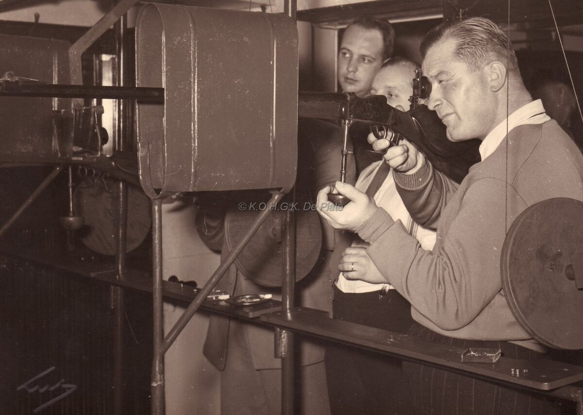 Karel SYS, gewezen bokskampioen, in de schietstand van de schuttersvereniging "Les Carabiniers".